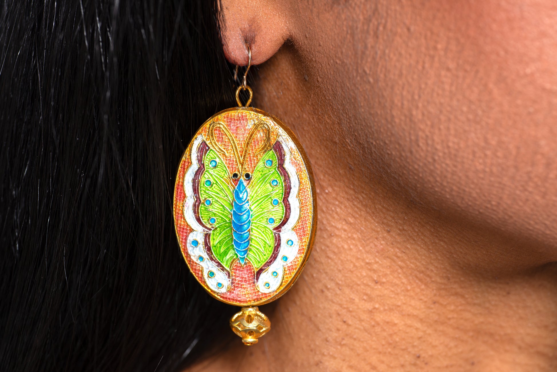 Lime green and peach colored cloisonné earrings with gold colored beads.