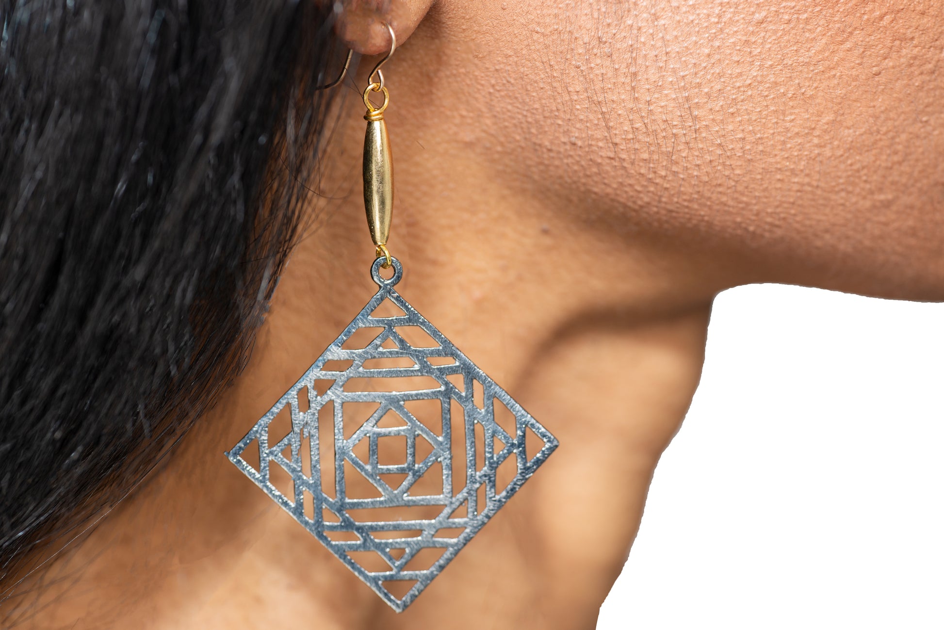 Gray metal laser cut square with gold accent bead earrings.