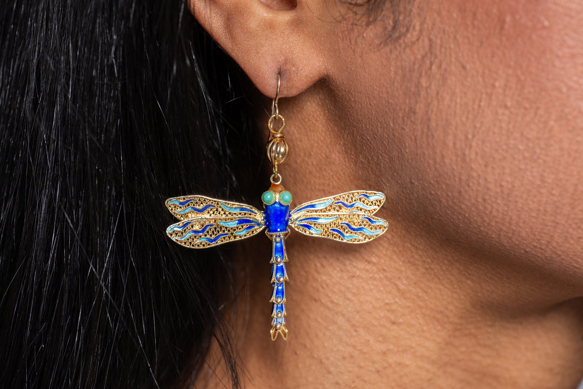 Turquoise eyed dragon fly earrings with blue cloisonné an gold beads.